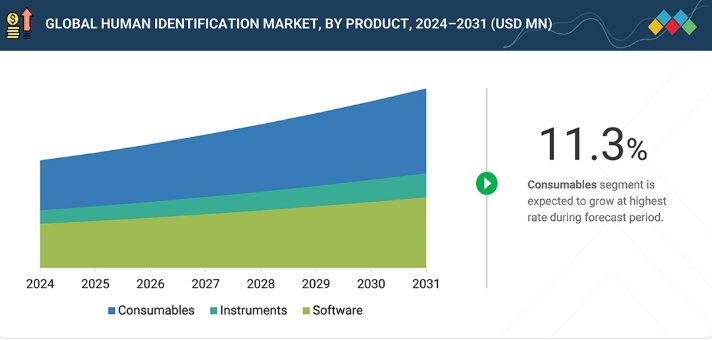 ヒト同定市場は、消耗品主導の収益に重点を置いた従来のモデルから、統合されたDNA分析ワークフローを重視するモデルへと移行しつつあります。従来、収益の大部分は、標準的な法医学検査で使用されるDNA増幅キット、抽出キット、定量試薬、迅速DNAカートリッジなどの必須消耗品から生み出されていました。しかし、今後の成長は、高度な機器やソフトウェアソリューションによってますます支えられるようになっています。これには、自動DNA抽出システム、次世代シーケンシング(NGS)ベースの法医学ゲノムパネル、確率的ジェノタイピングツールなどが含まれます。法医学研究所や研究機関は、効率の向上、未処理案件の削減、およびDNA証拠分析の精度向上を図るため、これらの技術を採用しています。その結果、ヒト同定のエコシステムは、より技術主導型のモデルへと進化しています。この新しいアプローチでは、消耗品、機器、およびソフトウェアが連携し、法執行機関や司法制度に対して、より迅速かつ信頼性の高いヒト同定結果を提供します。