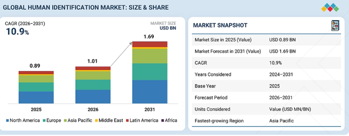 世界の個人識別市場は、2025年に8億9,000万米ドルと評価され、2026年には10億1,000万米ドルに達しました。2026年から2031年にかけては堅調な年平均成長率(CAGR)10.9%で拡大し、同期間の終わりには16億9,000万米ドルに達すると予測されています。個人識別技術は、主にDNAに基づく分析を通じて、生物学的証拠を用いて個人の身元を特定または確認するために使用されます。これらのソリューションは、法医学捜査、親子鑑定、行方不明者の身元確認、災害犠牲者の身元確認、および関連する用途に広く適用されており、DNAの抽出、定量、増幅、分析、解釈の各ワークフローで使用される消耗品、機器、ソフトウェアが含まれます。