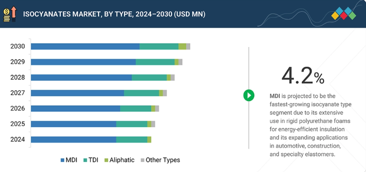 MDIは、予測期間中にイソシアネート市場において最も急速に成長するタイプセグメントとなる見込みです。