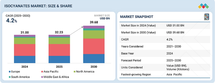 イソシアネート市場は、予測期間中に年平均成長率(CAGR)4.2%で拡大し、2025年の322億3,000万米ドルから2030年には396億8,000万米ドルに達すると見込まれています。需要の主な推進要因は、イソシアネートの産業用途の拡大と、ポリウレタン製製品の増加です。都市開発や新築工事の増加に伴い、世界的な省エネ目標を達成するため、住宅や商業ビルの外断熱材として使用される硬質ポリウレタンフォームの需要が高まっています。同時に、自動車産業の成長により、シートや電気自動車の部品などの内装部品において、軽量で高性能かつ耐久性に優れた素材へのニーズが生まれています。さらに、家具、寝具、家電製品を生産する業界では、軟質ポリウレタンフォームの使用が拡大し続けています。新興市場、特にアジア太平洋地域における急速な工業化は、イソシアネートの下流需要を満たすための製造能力の継続的な拡大を牽引するでしょう。最後に、環境に優しい製品に対する規制上の重視が、低VOCおよびバイオベースのイソシアネート系製品の開発を促進しています。