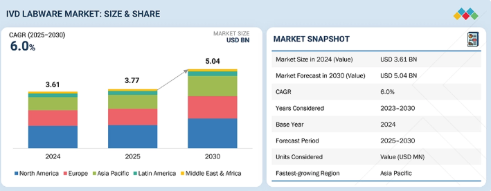 世界の体外診断用検査器具市場は、2025年に37億7,000万米ドルと評価され、2030年までに50億4,000万米ドルに達すると予測されており、予測期間中に年平均成長率(CAGR)6.0%で成長する見込みである。この成長は主に、特に分子診断、免疫測定、臨床化学分野における高スループットかつ正確な診断検査への需要増加によって牽引されている。慢性疾患および感染症の有病率上昇が、信頼性の高い検査室検査の必要性をさらに高めています。加えて、医療インフラの近代化と、無菌性・効率性を確保するための使い捨て検査器具の採用が、先進国・新興国を問わず市場拡大を支える主要要因です。