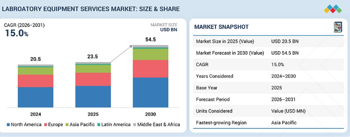 実験装置サービス市場は、2024年に205億米ドルと評価され、2025年には235億米ドルに達し、2025年から2030年にかけて15.0%の堅調なCAGRで成長し、期間末までに545億米ドルの予測評価額に達すると見込まれている。市場成長は、規制および品質コンプライアンス要件の高まりによって牽引されている。設置、修理、故障対応、保守サービスセグメントは、引き続き市場の主要セグメントである。将来の見通しは、遠隔監視、予知保全、IoTの採用拡大によって形作られる可能性が高い。