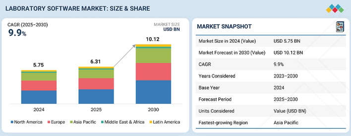 世界の検査室ソフトウェア市場は、予測期間中に9.9%の高いCAGRで成長し、2025年の63億1000万米ドルから2030年までに101億2000万米ドルに達すると予測されている。製薬、バイオテクノロジー、診断分野におけるデータの複雑化が進む中、効率性、正確性、規制順守を強化する先進的なツールの導入が組織に求められている。