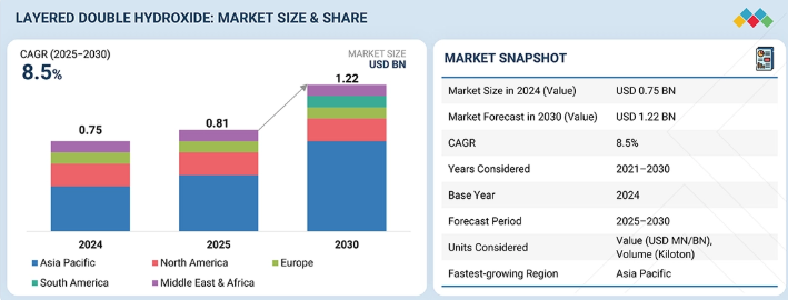 世界の層状複水酸化物市場は、2025年の8.1億米ドルから2030年には12.2億米ドルに成長し、予測期間中の年平均成長率は8.5%と予測されています。同市場は、建築、医薬品、水処理などの産業における用途の拡大により、着実な成長を遂げています。難燃剤、触媒、吸着剤に対する需要の高まりが採用を後押ししています。環境規制の増加と持続可能な材料への世界的な取り組みも、LDHの使用を加速しています。