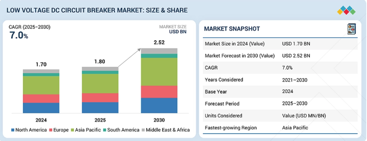 低電圧直流遮断器市場は、予測期間中に年平均成長率(CAGR)7.0%で成長し、2025年の推定18億米ドルから2030年までに25億2000万米ドルに達すると見込まれています。再生可能エネルギー設備、EV充電インフラ、蓄電池システムにおける直流ベースの電力システムの採用拡大が、低電圧直流遮断器市場の主要な推進要因です。これらの用途では信頼性の高い直流故障保護が求められ、先進的な低電圧直流遮断器への需要が加速している。