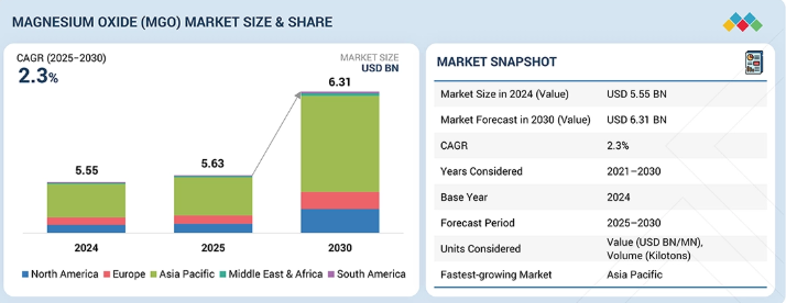 酸化マグネシウム(MgO)市場は、2025年の56.3億米ドルから2030年には63.1億米ドルに達し、2025年から2030年までの年平均成長率は2.3%を記録すると予測されています。市場成長の背景には、鉄鋼生産の増加、高度耐火物用途の需要増加、建築・建材での広範な使用、高度セラミック・電子部品での用途拡大があります。