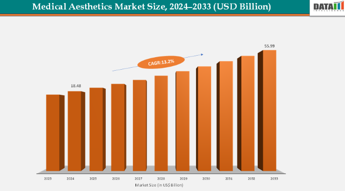 世界の医療美容市場規模は、2024年の184億8,000万米ドルから2033年までに559億9,000万米ドルへ成長し、予測期間中に年平均成長率(CAGR)13.2%を記録すると予測されています。世界的な医療美容市場は、低侵襲・非侵襲的施術への需要増加、エネルギーベース機器の技術進歩、美容的改善に対する消費者意識の高まりを背景に堅調な成長を遂げている。ボツリヌス毒素、皮膚充填剤、ボディコンターリング機器、医療美容などの美容ソリューションは、ライフスタイルの変化、美容施術の受容拡大、ソーシャルメディアの影響により、多様な年齢層で強い普及を見せている。