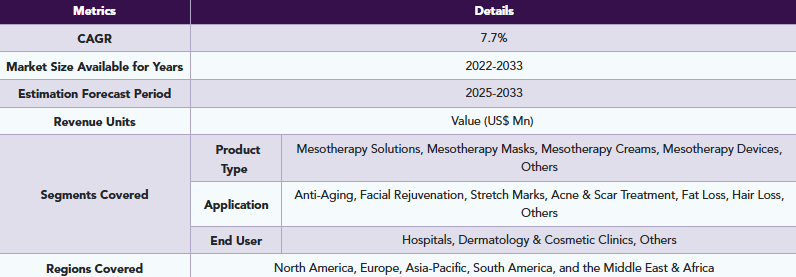 世界のメソセラピー市場(2025 – 2033):製品種類別、 用途別、エンドユーザー別、地域別分析レポート