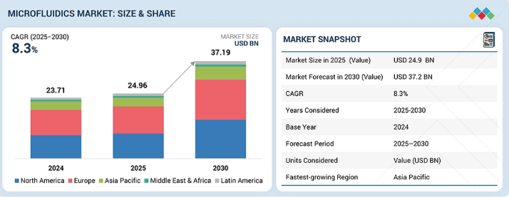 世界のマイクロ流体市場は、2024年に237億1000万米ドルと評価され、2025年には249億6000万米ドルに達し、2025年から2030年にかけて8.3%の堅調なCAGRで成長し、期間末までに371億9000万米ドルの予測評価額に達すると見込まれている。マイクロ流体市場の成長を牽引する複数の重要な要因が、その拡大と応用範囲の拡大を促進している。迅速・正確・低コストな機器を必要とするポイントオブケア診断(POCT)への需要が高まっている。さらに、個別化医療への潮流は、精密なバイオマーカー分析とハイスループットスクリーニングの必要性を高めている。研究開発費の増加は、新規・革新的技術の研究・調査を支援し、ひいては市場成長を支えている。