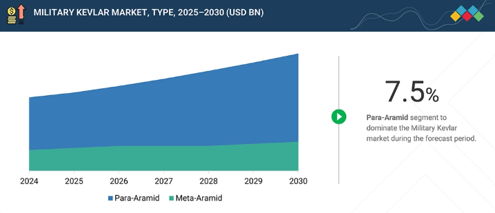 業界における新たなトレンドと技術としては、国土安全保障、防弾保護、および光ファイバー技術が挙げられ、これらは原材料の需要を増加させています。例えば、防弾保護分野では、企業は防弾性と耐熱性を兼ね備えた軽量ソリューションに注力しています。光ファイバー産業の進歩もまた、軍用ケブラー市場の発展を後押ししています。業務効率の向上と最適化へのニーズが高まる中、これらの新たな収益源が市場を牽引すると予想されます。