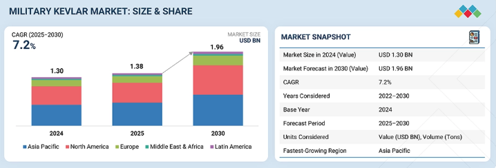 軍事用ケブラー市場は、2025年の13億8,000万米ドルから、2030年までに19億6,000万米ドルに達すると予測されており、予測期間中の年平均成長率(CAGR)は7.2%となる見込みです。各国が新たな課題に対応するために軍事力を強化していることから、世界的な防衛費の増加が軍事用ケブラー市場の成長を牽引しています。また、時間の経過とともに変化し続ける継続的な安全保障上のリスクにより、テロや地域紛争に対する新しく改良された防護ソリューションを模索するよう、各国政府に圧力がかかっています。例えば、軍事近代化プログラムでは、アラミド繊維のような軽量で耐久性の高い素材が採用されており、これにより性能がさらに向上しています。