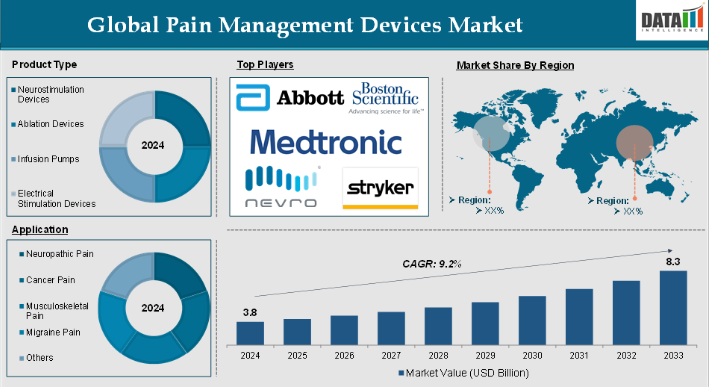 疼痛管理デバイスの世界市場は、2024年に38億米ドルに達し、2033年には83億米ドルに達すると予測され、予測期間2025-2033年のCAGRは9.2%で成長する見込みです。