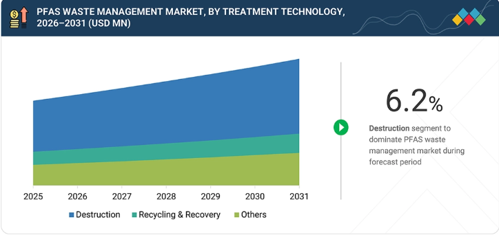 PFAS廃棄物管理市場は、2026年の22億1,000万米ドルから2031年までに29億8,000万米ドルに達すると予測されており、2026年から2031年までの年平均成長率(CAGR)は6.2%となる見込みです。世界のPFAS廃棄物管理市場は、厳格な環境規制、一般市民の意識の高まり、技術の進歩、PFAS研究に対する政府の助成金、およびPFAS処理中に発生する処理残渣の適切な管理の必要性により、力強い成長を遂げています。化学品製造および水処理の各セクターでは、規制順守、負債の削減、そして持続可能性の目標達成のために、高度な分解技術を導入しています。