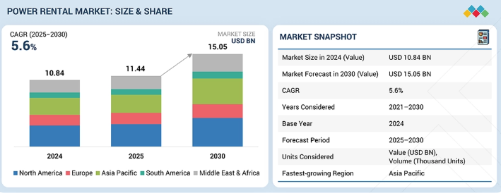 世界の電力レンタル市場規模は、2025年の114億4,000万米ドルから、予測期間中に年平均成長率(CAGR)5.6%で拡大し、2030年には150億5,000万米ドルに達すると見込まれています。この市場は、建設、イベント、石油・ガス、公益事業など、さまざまな業界における一時的な電力ソリューションへの需要の高まりに牽引されています。これらの業界では、機器のレンタルが柔軟性と費用対効果をもたらします。建設活動の増加に伴い、建設現場の照明や仮設施設の稼働など、電力レンタル機器の需要が高まっています。さらに、頻発する自然災害、停電、送電網の不安定化により、バックアップ電源ソリューションの必要性が高まっており、企業はレンタル会社が提供する予備電源ソリューションへの投資を進めています。この要因も市場の成長を後押ししています。