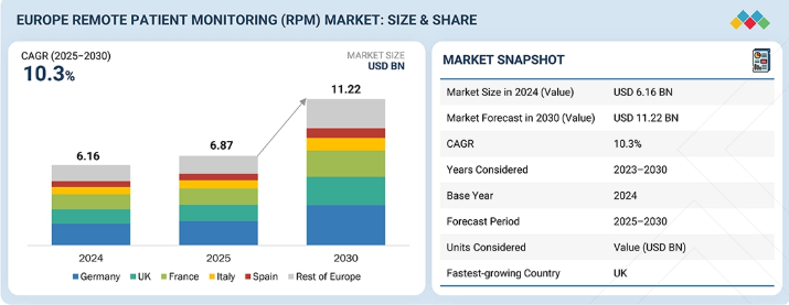 欧州のリモート患者モニタリング(RPM)市場は、2025年の68億7,000万米ドルから2030年までに112億2,000万米ドルに達すると予測されており、2025年から2030年までの年間平均成長率(CAGR)は10.3%となる見込みである。市場成長は、在宅ケアモデルへの投資増加、国境を越えたデジタルヘルスインフラの強化、分散型環境における早期介入支援・再入院削減・ケア継続性向上のためのリアルタイム患者データに対する医療提供者の需要増大によって牽引されている。