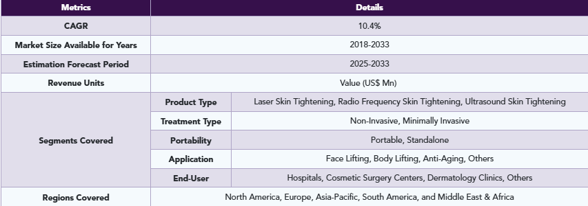皮膚引き締め装置市場は2024年に34億8,000万米ドルに達し、2033年までに81億1,000万米ドルに達すると予測されています。2025年から2033年の予測期間において、年平均成長率(CAGR)10.4%で成長すると見込まれています。