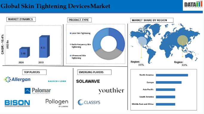 世界の皮膚引き締め装置市場における主要グローバルプレイヤーには、Allergan Plc.、Bausch Health Companies Inc.、Palomar Medical Technologies、BISON MEDICAL、Pollogen、BRERA MEDICAL TECHNOLOGIES S.R.L.、Cutera、Venus Concept、Alma Lasers、Beijing Winkonlaser Technology Ltd.などが含まれる。