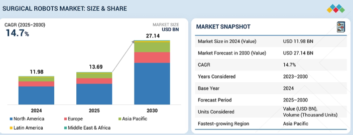 世界の外科用ロボット市場は、2024年に119億8000万米ドルと評価され、2025年には136億9000万米ドルに達した。2024年から2030年にかけて堅調な年平均成長率(CAGR)14.7%で拡大し、期間末までに271億4000万米ドルに達すると予測されている。外科用ロボット市場の成長は、術後の痛みの軽減、入院期間の短縮、回復の加速、合併症リスクの低減といった利点をもたらす低侵襲手術への需要増加によって牽引されている。慢性疾患の有病率の上昇と高齢人口の増加は、高精度を必要とする複雑な外科手術の件数を増加させている。