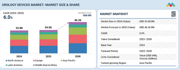 世界の泌尿器科機器市場は、2025年に355億6000万米ドルと推定され、2030年までに462億6000万米ドルに達すると予測されており、予測期間中に年平均成長率(CAGR)6.0%で成長する見込みである。泌尿器疾患、慢性代謝性疾患、生活習慣病の有病率上昇が市場を強力に牽引している。前立腺肥大症、泌尿器悪性腫瘍、腎疾患の症例増加により、高度な泌尿器科医療機器への需要がさらに高まっている。同時に、特に低侵襲内視鏡技術といった先進的診断検査手法の出現が、診断精度と処置正確性を保証する技術的に高度な泌尿器科医療機器の需要を促進している。さらに、医療提供者と患者双方における高度な治療選択肢や泌尿器科的介入による治療成果向上の認識拡大が、特に新興医療市場において市場の拡大に寄与している。これらの要因が相まって、先進泌尿器科機器の導入が加速し、患者ケアと臨床成果が向上し、世界的な泌尿器科機器市場の成長軌道を強化している。
